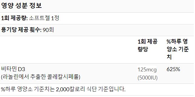 캘리포니아 골드 뉴트리션의 비타민D3 5000IU는 하루 영양소기준치의 625%에 달하는 비타민D를 가지고있다