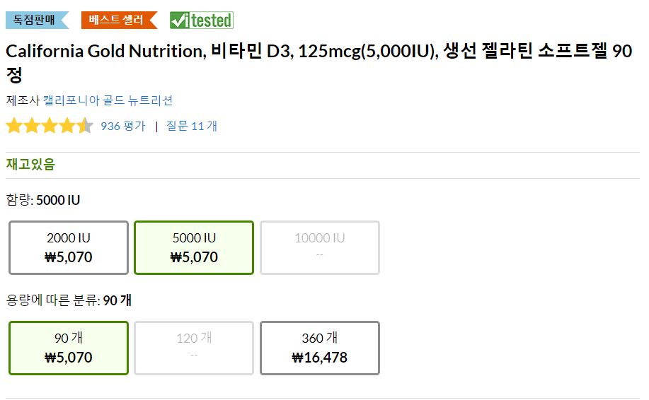 캘리포니아 골드 뉴트리션의 비타민D3 5000IU는 아이허브 홈페이지에서 5070원 (3월21환율 기준) 에 판매중이다