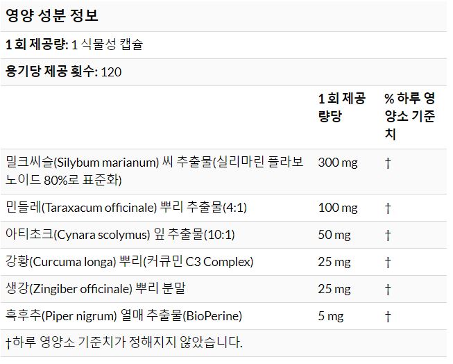 또한 간에 좋다고 알려진 민들레 뿌리 추출물, 강황 뿌리 추출물, 생강 뿌리 분말, 흑후추 열매 추출물이 들어있다