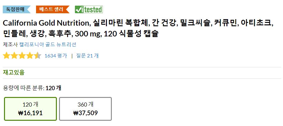 캘리포니아 골드 뉴트리션, 실리마린 복합체(간 건강, 밀크씨슬, 커큐민, 아티초크, 민들레, 생강, 흑후추로 이루어진)는 현재 아이허브에서 120개 패키지를 16191원에(3월22일 환율 기준) 판매중이다. 360캡슐은 37509원이니 필요한 용량을 비교해보고 구입하면 되겠다