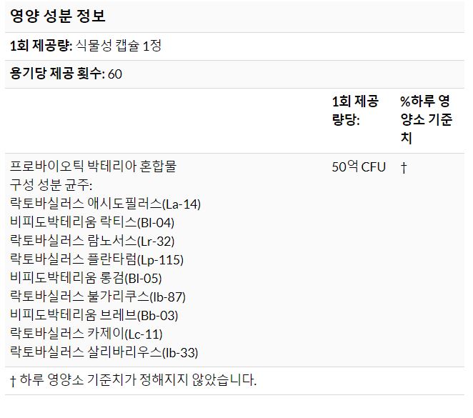 9가지 활성 균주로 구성되어있고 각각은 이중포장되어있다 사람이 먹는것과 거의 똑같다
